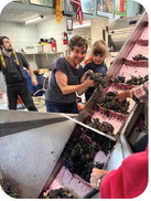Using our trusty forklift, I weigh each macro bin of freshly picked grapes (1000+/lbs) then tip that fruit into the hopper attached to our elevator. As the grape clusters slowly travel up the elevator, WifeSuzy (Quality Control) and crew pick out any MOG (Material Other than Grapes). Many wineries do not take the time to do this step, but we feel it is important. Depending on whether we are processing red or white/ rosé grapes, different pieces of equipment are at the receiving end of that elevator.